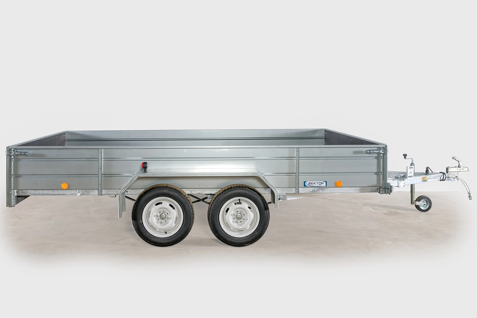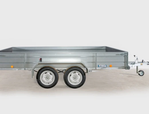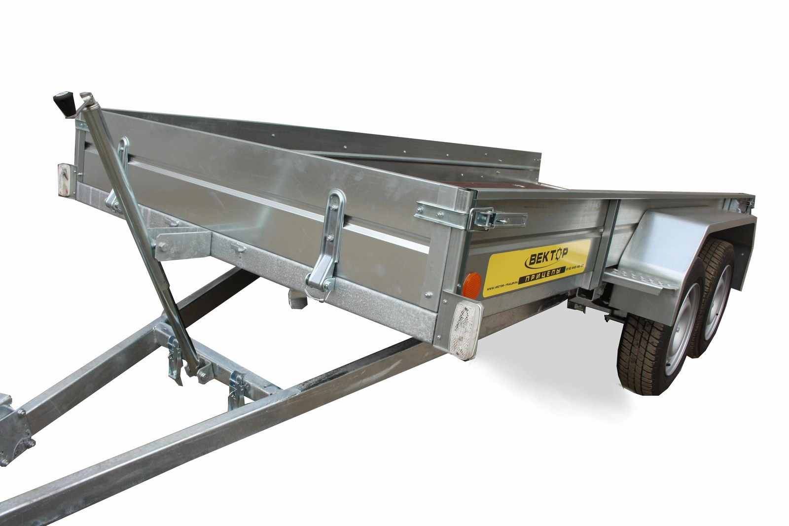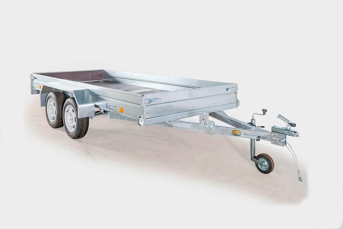 Рама, дышло и ось прицепа полностью оцинкованы методом горячего цинкования изнутри и снаружи. Борта и крылья из оцинкованной стали. Прицеп двухосный, без тормозов, снабжен откидным кузовом, передний и задний борта откидные, с возможностью быстрого съёма. Дышло V-образное. Днище - ламинированная фанера. Подвеска колес (R13) на четырёх полуэллиптических переменного сечения рессорах с гидравлическими амортизаторами. Размеры кузова 3500*1800 мм. Высота бортов 240 или 380 мм. Грузоподъёмность 355 кг, фактическая 820 кг.