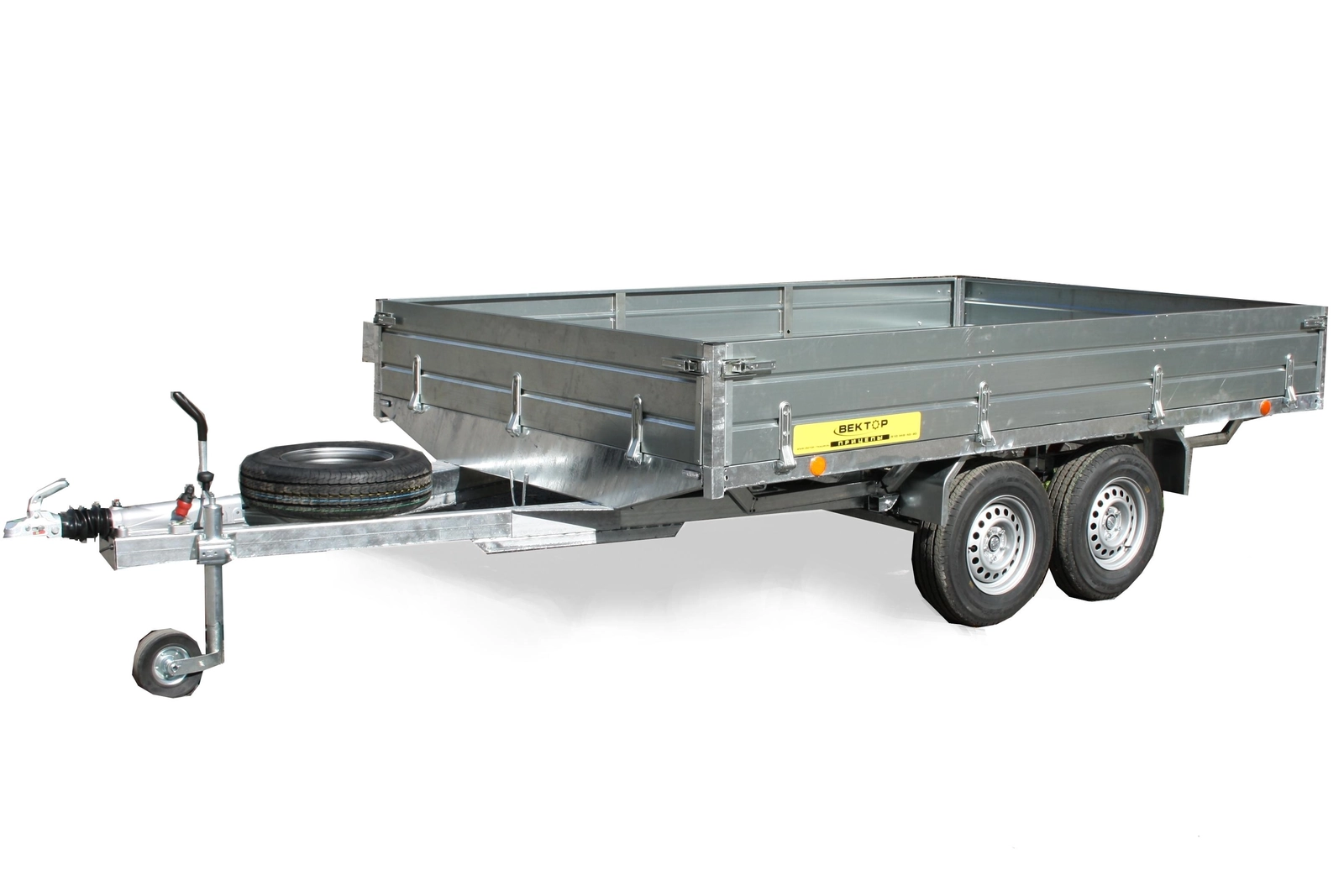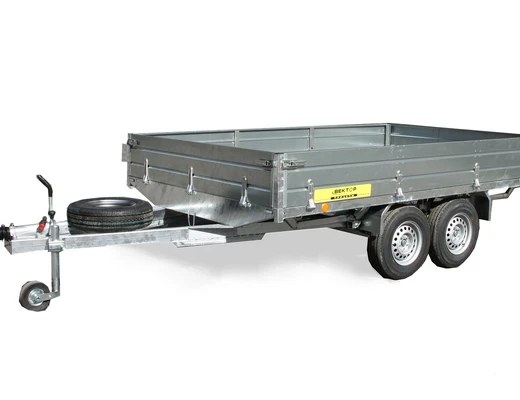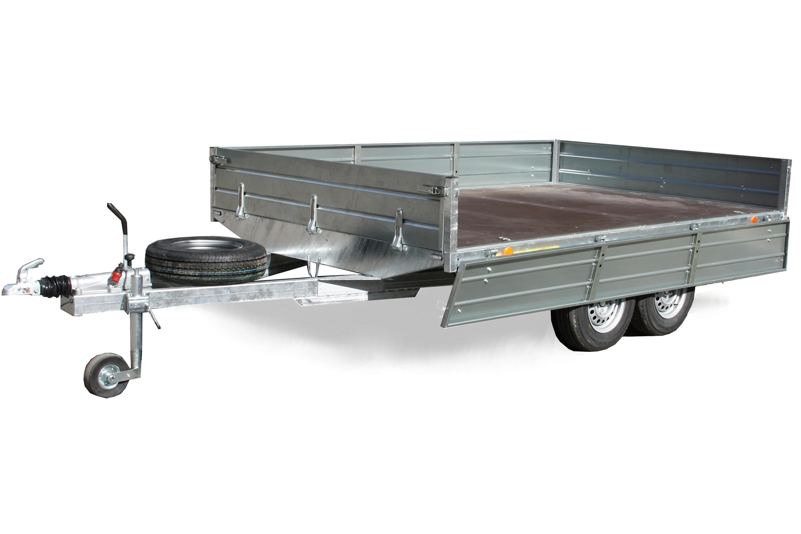 Бортовой прицеп. Оснащён тормозом. Все борта откидываются. Кузов не откидной.
