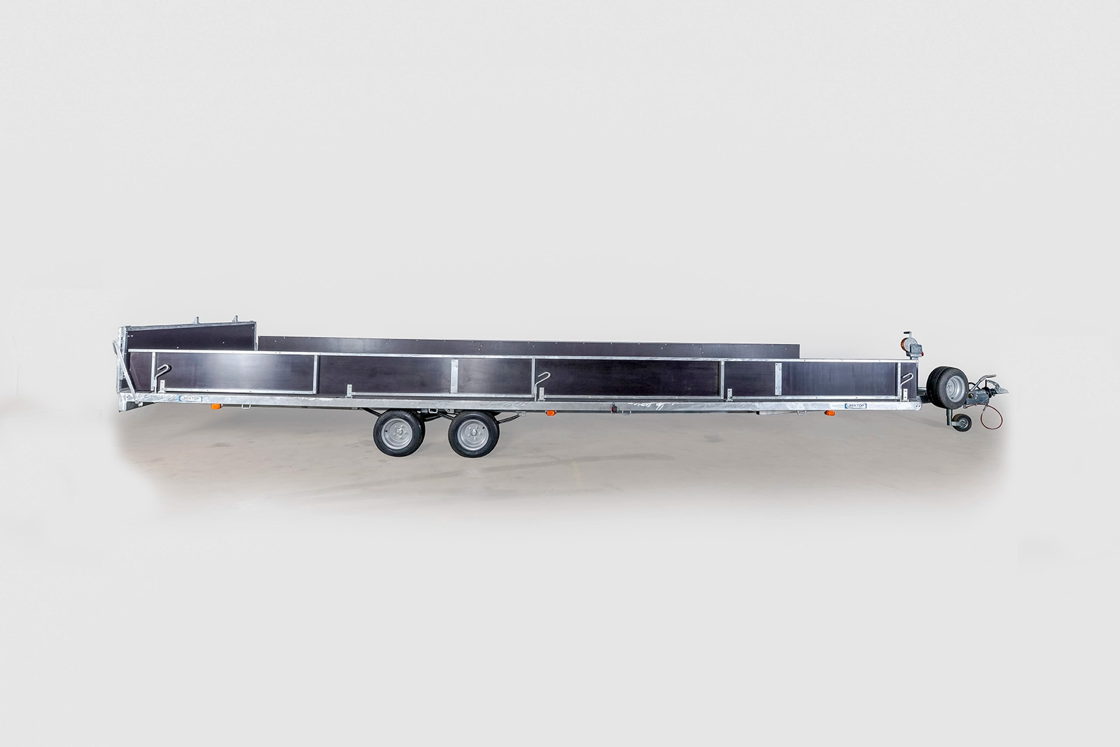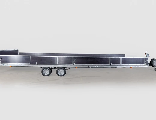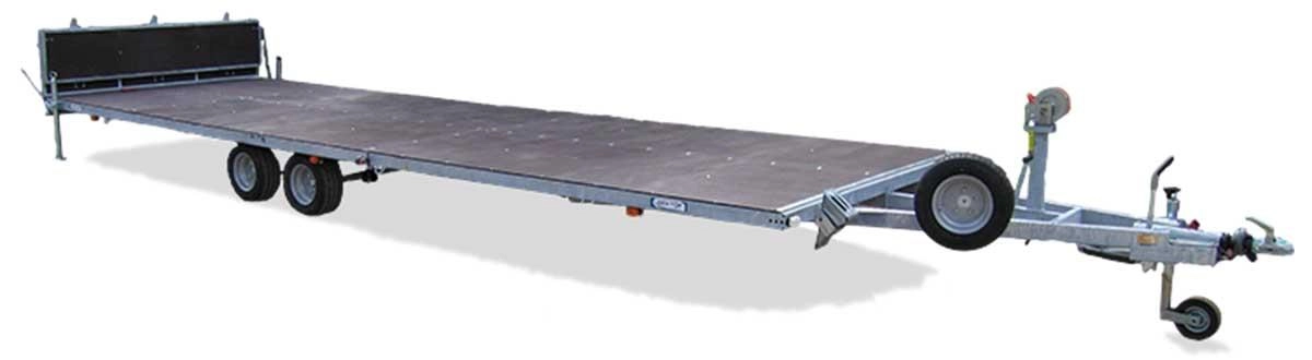 Легковой прицеп для перевозки судна на воздушной подушке или для перевозки вертолета. Прицеп двухосный, с тормозом наката.