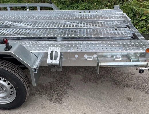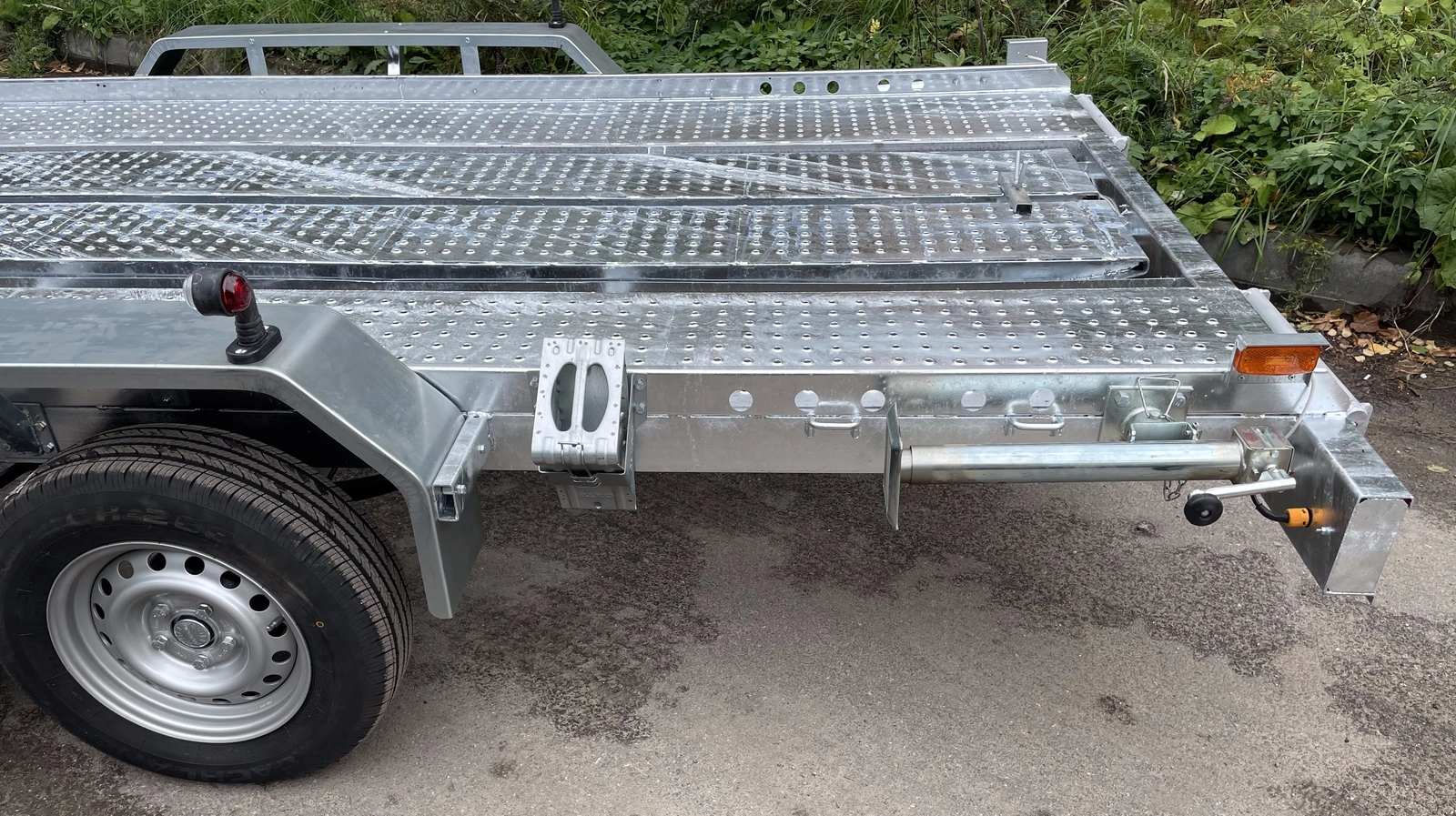 Рама, ось прицепа, трапы для заезда полностью оцинкованы методом горячего цинкования. Крылья выполнены из оцинкованной стали. Прицеп двухосный, с тормозом наката. Подвеска колес (R14) на четырёх полуэллиптических рессорах с гидравлическими амортизаторами. Полная масса 2400 кг. Грузоподъёмность 1500 кг. Габаритные размеры: - длина с дышлом 5925; - ширина 2450; - высота 1280; - база 3400+730; - колея 2245; Габаритные размеры платформы: - длина 4000; - ширина 2000. Опорное колесо; запасное колесо; опорные стойки сзади, на боковой части рамы прицепа; трапы для заезда; ручная лебёдка - в стандартной комплектации. Категория "Е" обязательна.