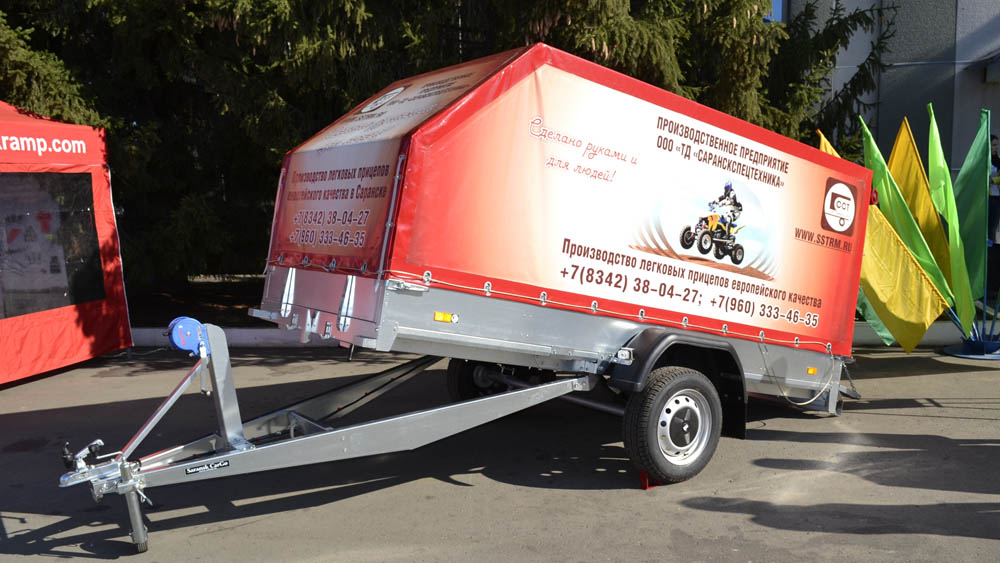 Одноосный прицеп ССТ-7132-08-У обладает расширенными функциональными возможностями. Прицеп полностью изготовлен из оцинкованного листа с применением лазерной технологии раскроя. Настил платформы и внутренние поверхности откидных бортов выполнены из влагостойкой фанеры толщиной 9 мм. Наиболее сложные узлы подвески (такие как – ступицы, амортизаторы, подрессорники) применены от отечественных серийных автомобилей. За дополнительную плату прицеп может быть укомплектован дугами, тентом и передним опорным колесом. Модель обладает функцией самосвала и дополнительно может комплектоваться кронштейном тали (лебедки) и автоматическим захватом платформы, что позволяет осуществлять загрузку/выгрузку снегоходов, квадроциклов, садовой техники. На прицеп могут быть установлены 15-дюймовые колеса (модель ССТ-7132-08-У R15, стоимость данного исполнения есть в прайс-листе).