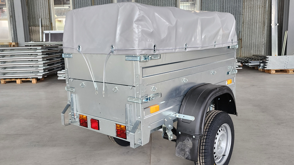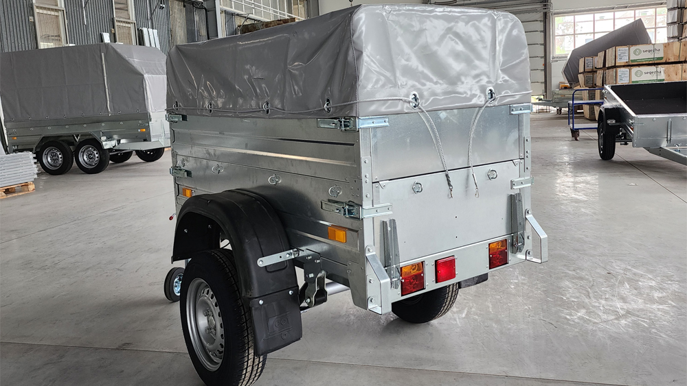 Наиболее сложные узлы подвески (такие как – ступицы, амортизаторы, подрессорники) применены от отечественных серийных автомобилей. Дышло переменного сечения с регулировкой сцепной головки по высоте. Дополнительно прицеп комплектуется дугами и тентом. Присутствие светотехники позволяет эксплуатировать прицеп на дорогах общего пользования.