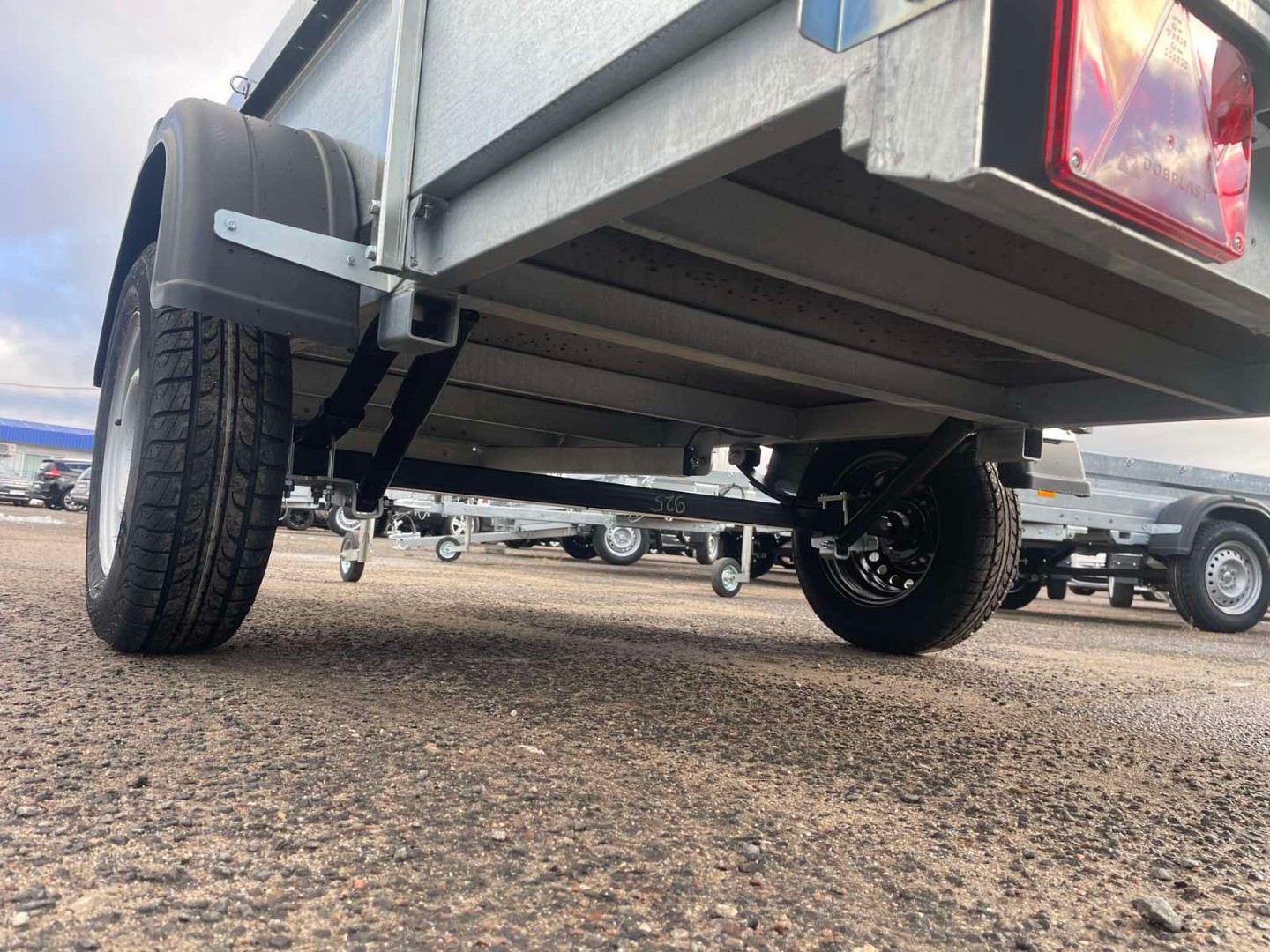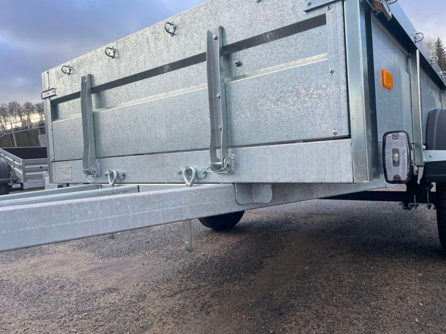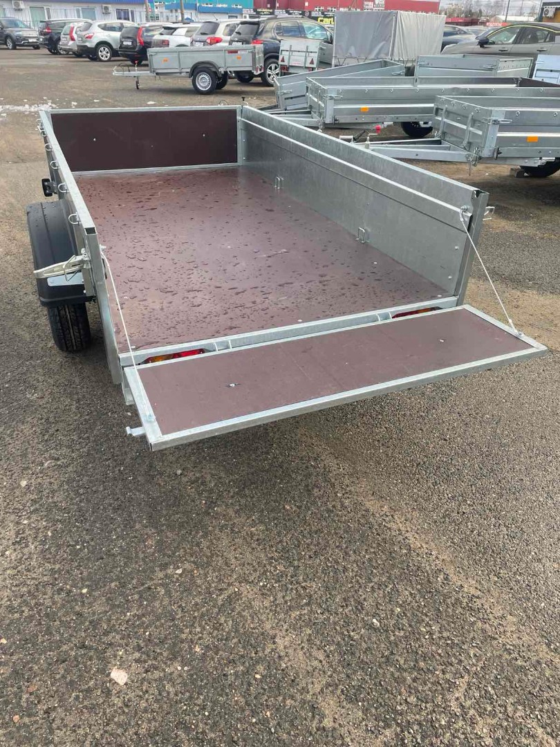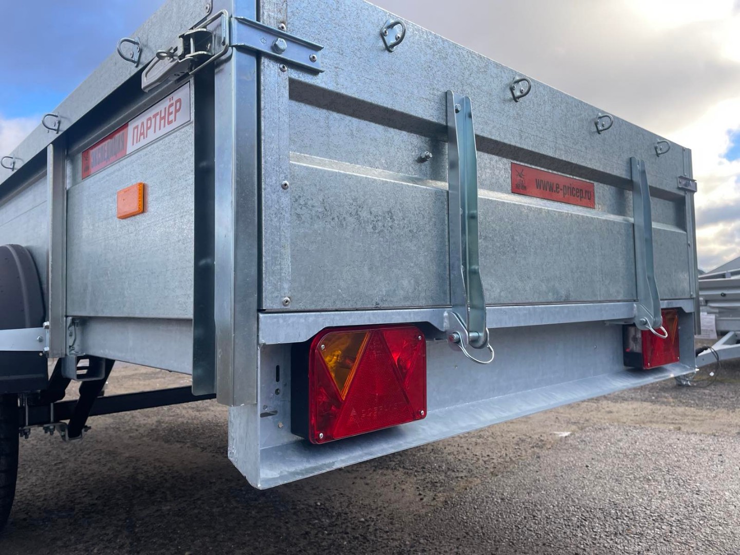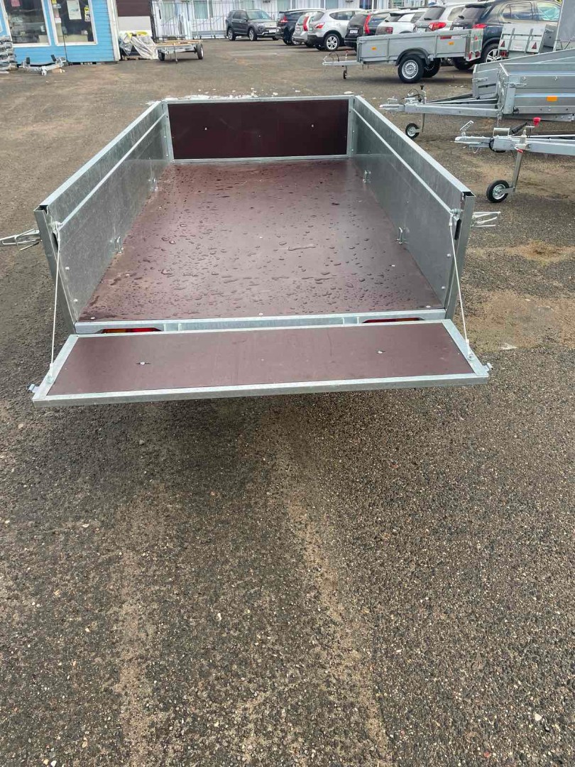 Борта гнутые с ребрами жесткости, монолитные по всей длине прицепа, высотой 400мм. Передний задний борт откидные быстросъемные с увеличенными по высоте петлями, усилены фанерой, которая утоплена внутрь борта и не «съедает» внутренний размер прицепа.