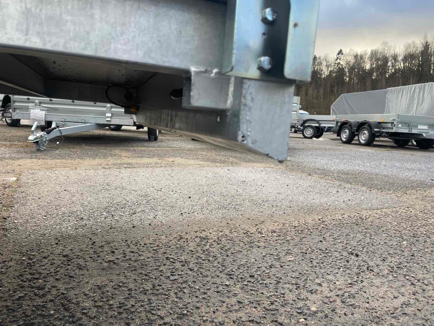 Цельные боковые борта крепятся 4 стойками (2 дополнительные центральные стойки), имеют дополнительные гибы для усиления, оборудованы скобами для крепления евро-тента. Имеют дополнительное жесткое крепление болтами к раме прицепа.