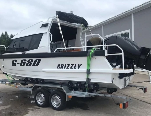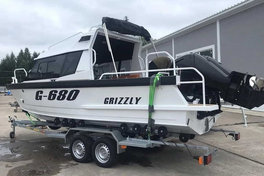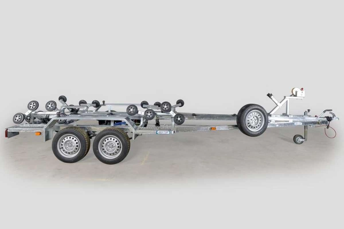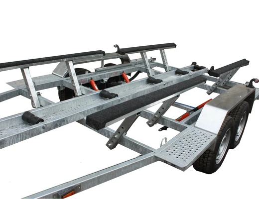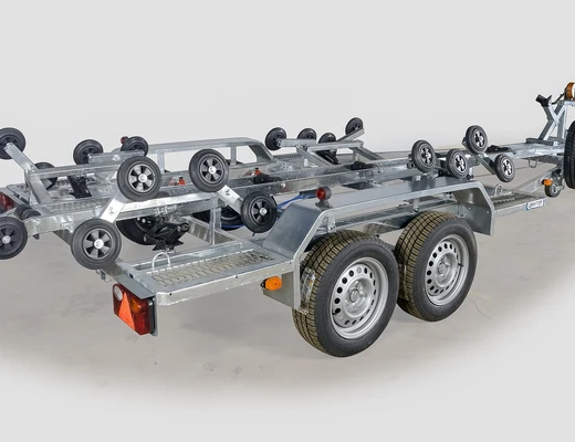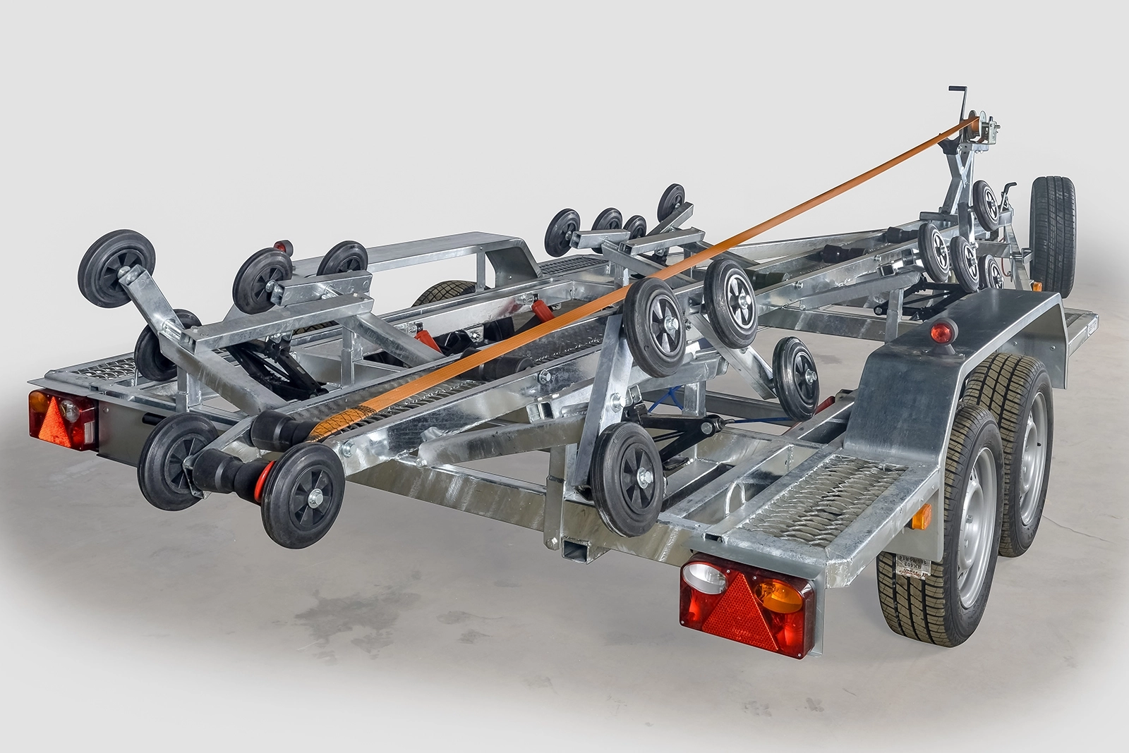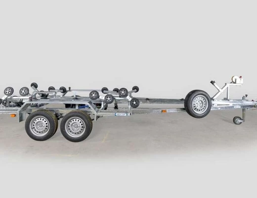 Рама, оси прицепа полностью оцинкованы методом горячего цинкования. Крылья выполнены из оцинкованной стали. Прицеп двухосный, с тормозом наката. Подвеска колес (R14) на четырёх полуэллиптических рессорах с гидравлическими амортизаторами. Оснащен 4-мя домкратами с качающимися спаренными колесами для установки лодки. Оборудован выдвигающимися на 1000 мм. штангами с фонарями. Сцепное устройство шарового типа, под шар D 50 мм. Полная масса 2400 кг. Грузоподъёмность 1730 кг. Габаритные размеры, мм - длина 6750; - ширина 2250; - высота 1240. Опорное колесо, носовой упор с установленной на нём ручной лебёдкой, кронштейн для "запаски", запасное колесо - в стандартной комплектации. Установка опции "направляющие для лодки" возможна только в комплектации с роликами. Категория "Е" обязательна.