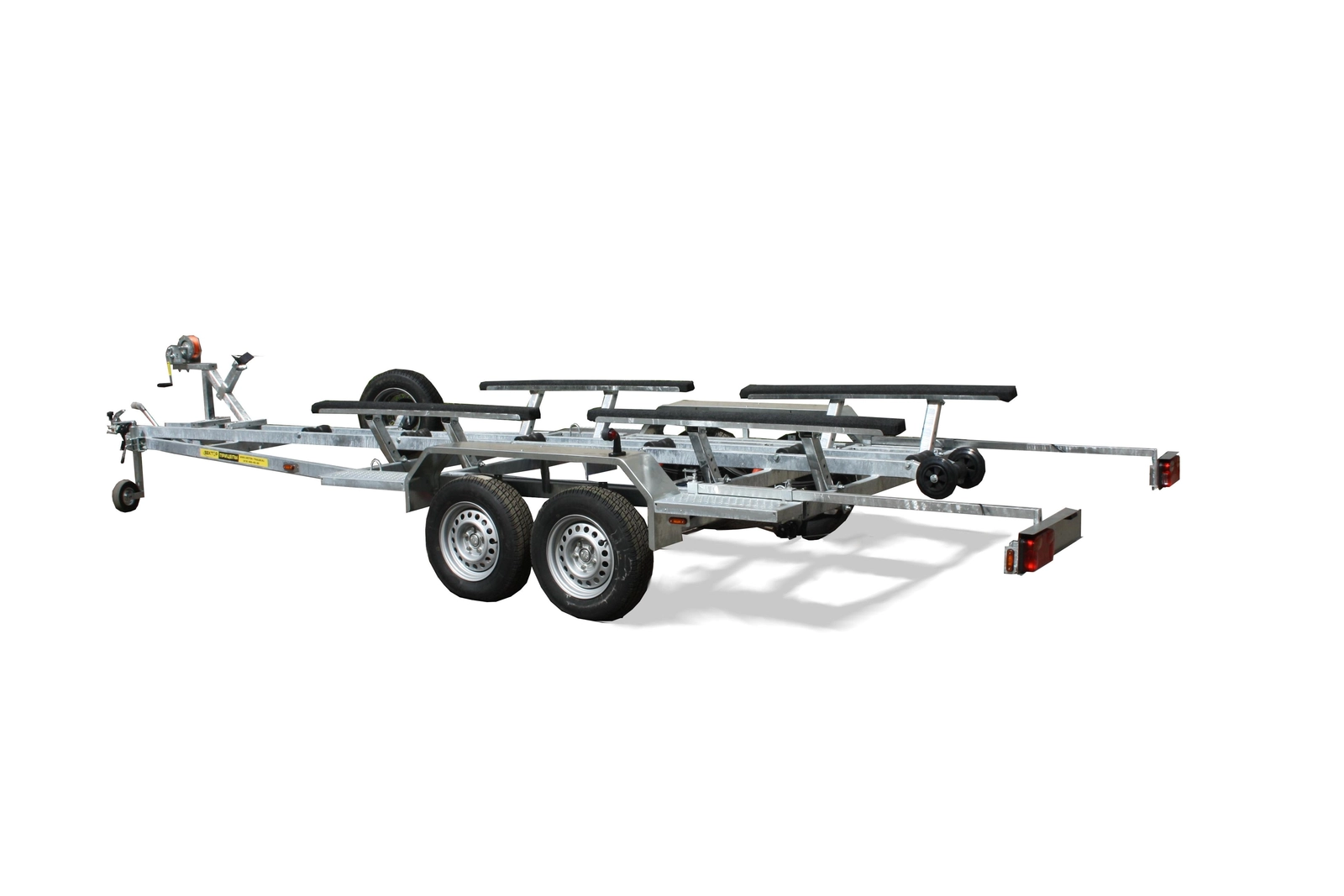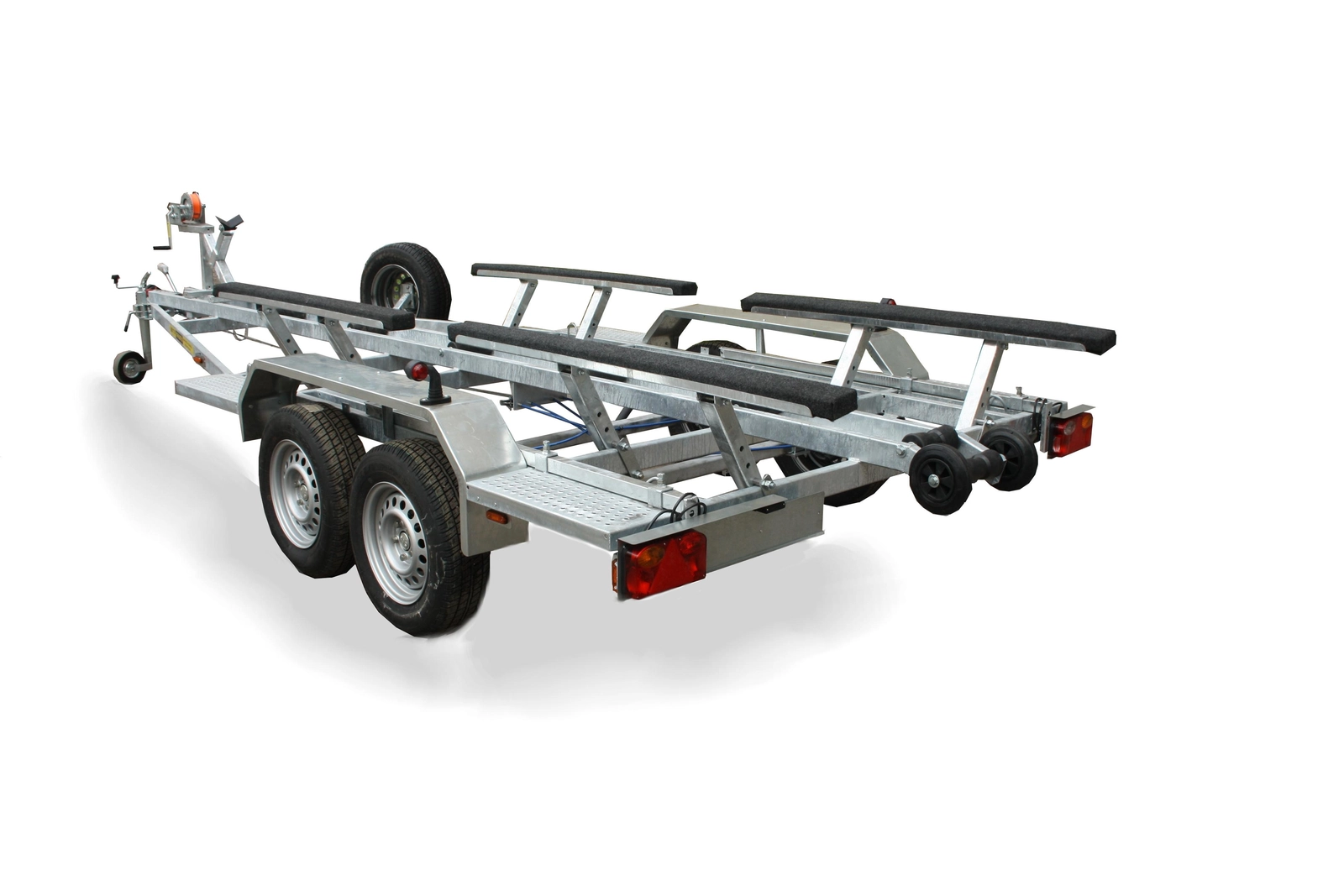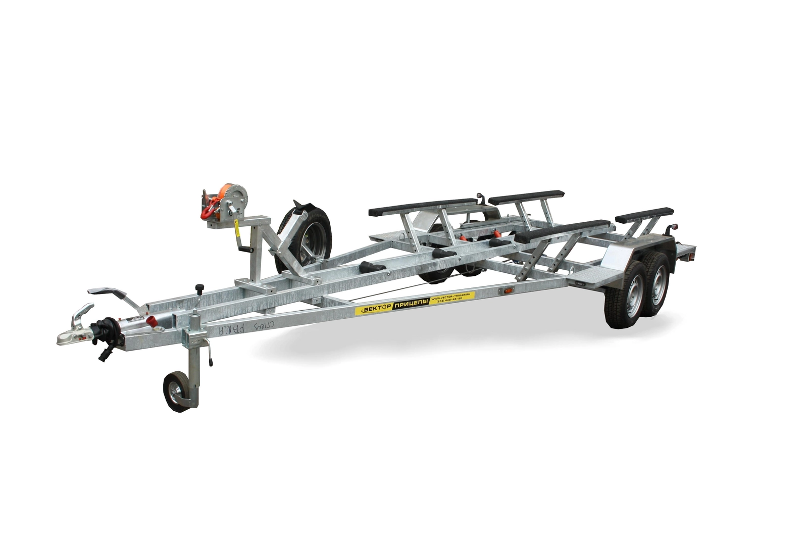 Легковой прицеп для перевозки лодки и для перевозки катера. Прицеп двухосный с тормозом наката, максимальная длинна плавательного средства 7 м.