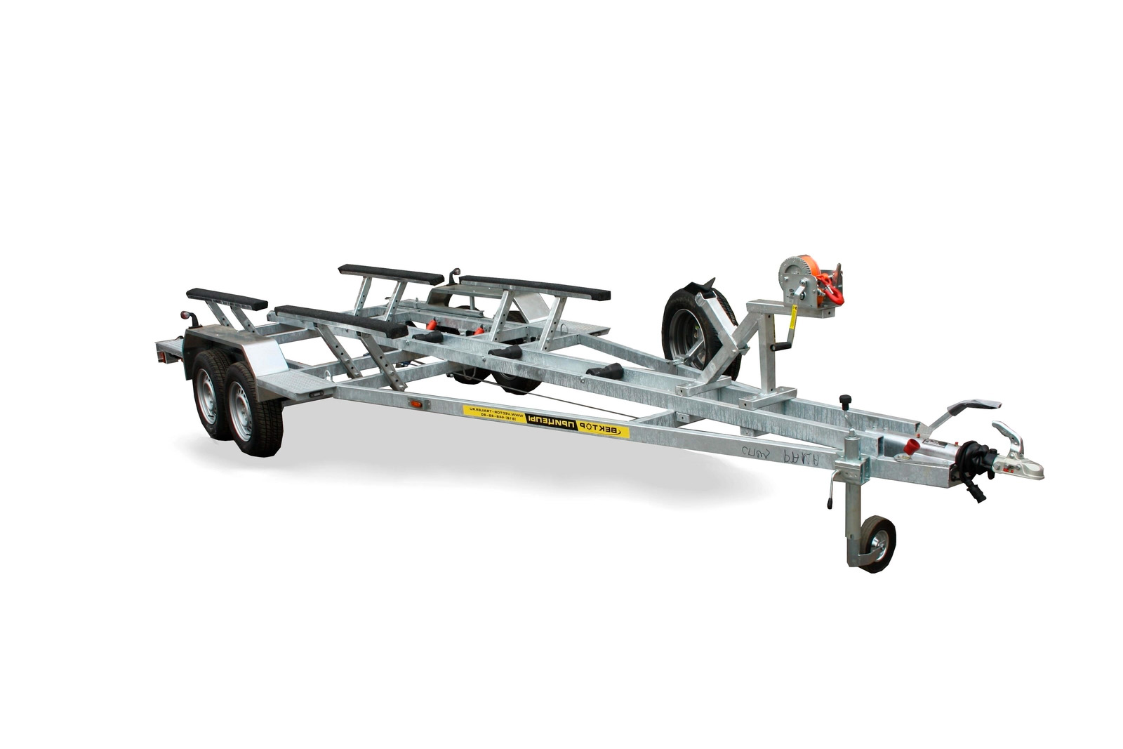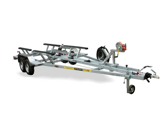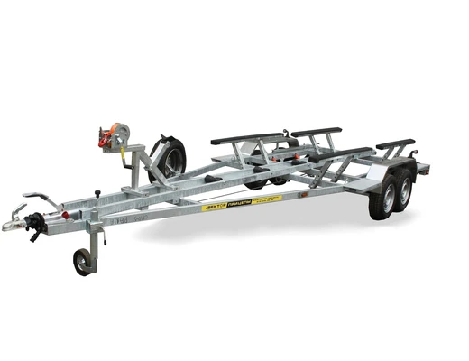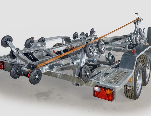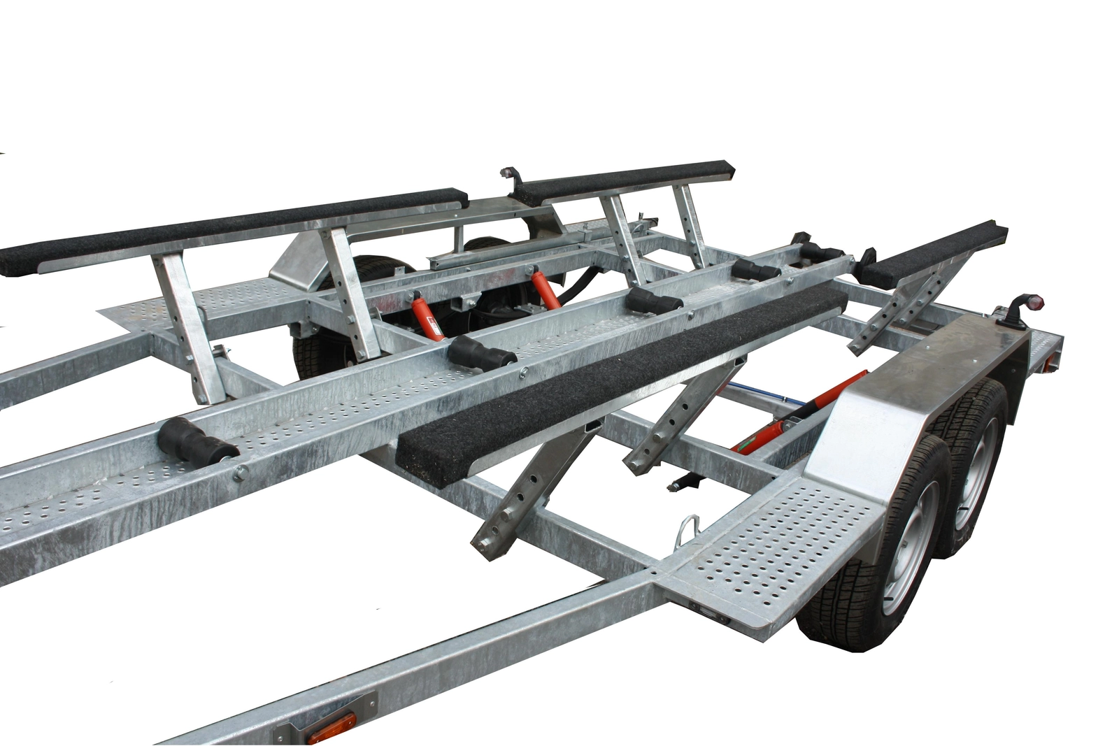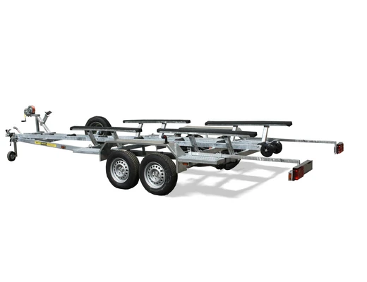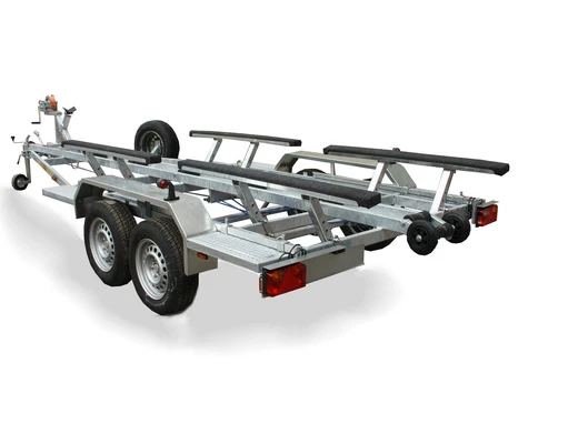 Легковой прицеп для перевозки лодки и для перевозки катера. Прицеп двухосный с тормозом наката, максимальная длинна плавательного средства 7 м.