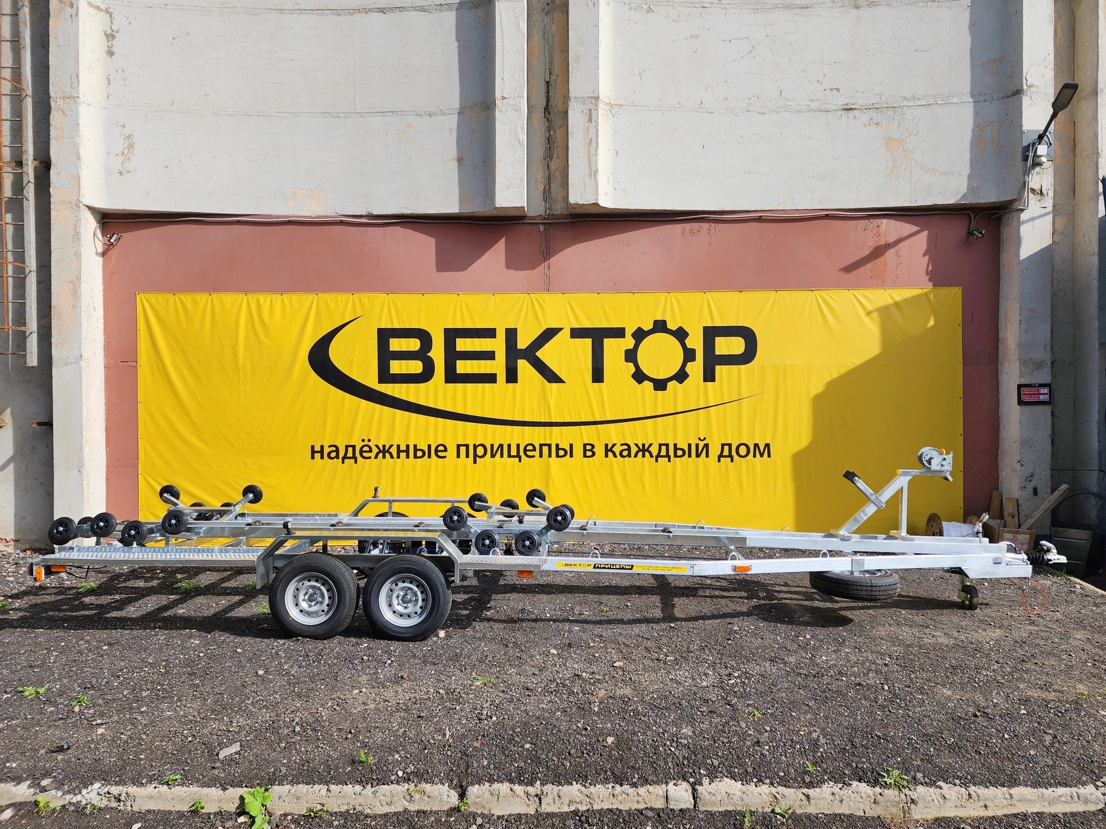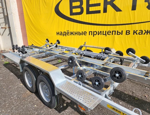 Рама, оси прицепа полностью оцинкованы методом горячего цинкования. Крылья выполнены из оцинкованной стали. Прицеп двухосный, с тормозом наката. Подвеска колес (R14) на четырёх полуэллиптических рессорах с гидравлическими амортизаторами (8шт). Оснащен 4-мя домкратами с качающимися спаренными колесами для установки лодки. Оборудован выдвигающимися (до 1000 мм) штангами с фонарями. Сцепное устройство шарового типа, под шар D 50 мм. Возможен вариант исполнения со сцепным устройством "петля НАТО" диаметром 76 мм. Полная масса 3500 кг.