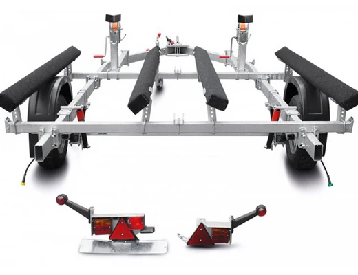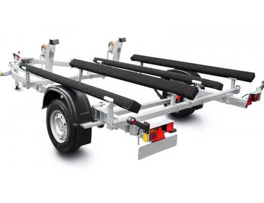 ● Передвижные ложементы могут быть установлены в любой точке поперечен рамы, в т. ч. и над крыльями прицепа, имеют регулируемый угол наклона и регулируемую высоту. Это позволяет установить их в наиболее удобное положение, избежать давления на продольные реданы, а также расположить технику максимально низко, тем самым обеспечить устойчивость прицепа при движении и осуществлять спуск судна на воду меньшей глубине. При перевозках и хранении судна на прицепе ложементы позволяют равномерно распределить вес техники и уменьшить давление на корпус судна.