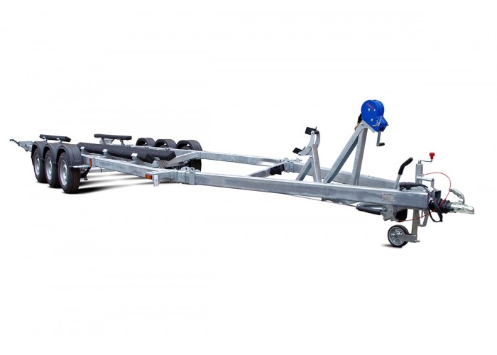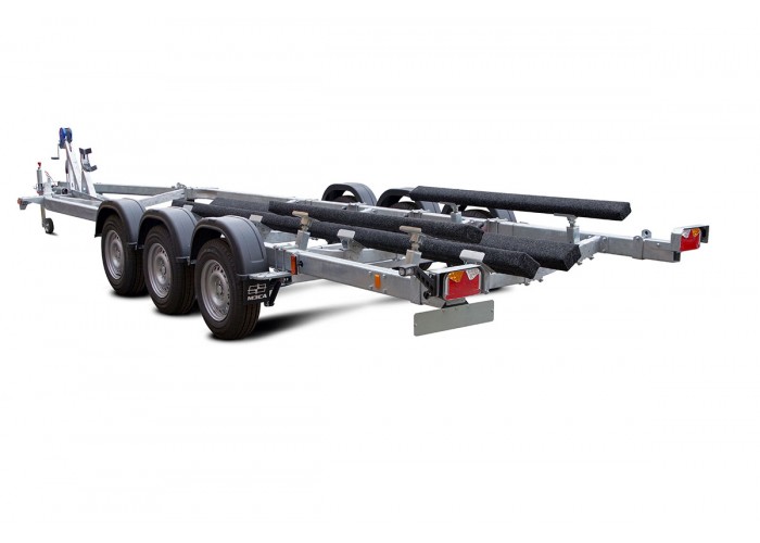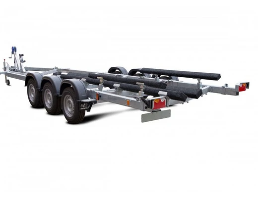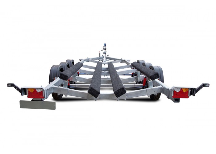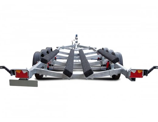 ● Ложементы могут быть установлены в любой точке поперечин рамы, имеют регулируемый угол наклона и регулируемую высоту. Это позволяет установить их в наиболее удобное положение, избежать давления на продольные реданы, а также расположить технику максимально низко, тем самым обеспечить устойчивость прицепа при движении и осуществлять спуск судна на воду при меньшей глубине. При перевозках и хранении судна на прицепе ложементы позволяют равномерно распределить вес и уменьшить давление на корпус судна.