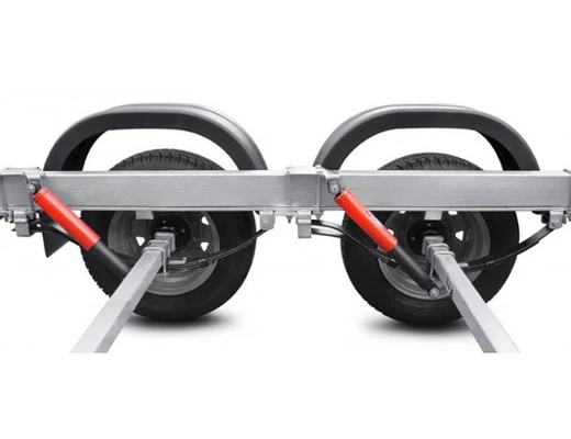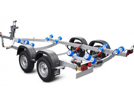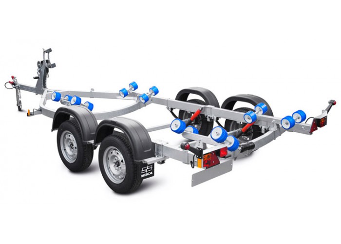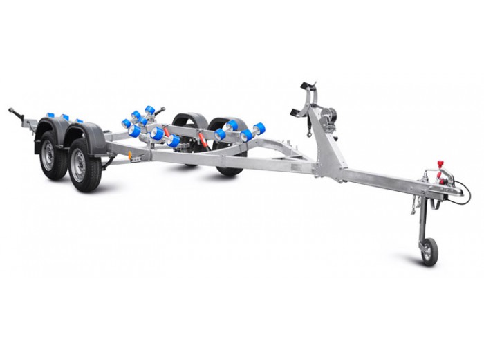 ● Роликовые опоры обеспечивают удобный спуск судна на воду и его подъём на сложных, необорудованных участках берега, где нет возможности заезда прицепа на достаточную глубину. Четыре роликовых модуля, с четырьмя роликами на каждом, могут быть установлены в любой точке поперечины рамы, их оцинкованный кронштейн имеет саморегулируемый угол наклона, а каждая пара роликов самостоятельно подстраивается под обводы судна. Такая конструкция облегчает центрирование и обеспечивает удобную поддержку судна и при его загрузке и выгрузке под большим углом. Вспомогательный килевой ролик на задней поперечине обеспечивает свободное скольжение киля при подъёме судна на прицеп.
