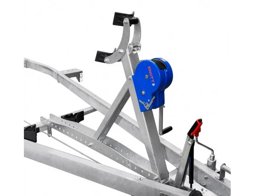 ● Передвижной носовой упор имеет регулируемую высоту и угол наклона. Он может быть отрегулирован и установлен в наиболее удобное положение для установки перевозимой техники. Лебёдка облегчает погрузку техники на прицеп и страхует её при спуске на воду.