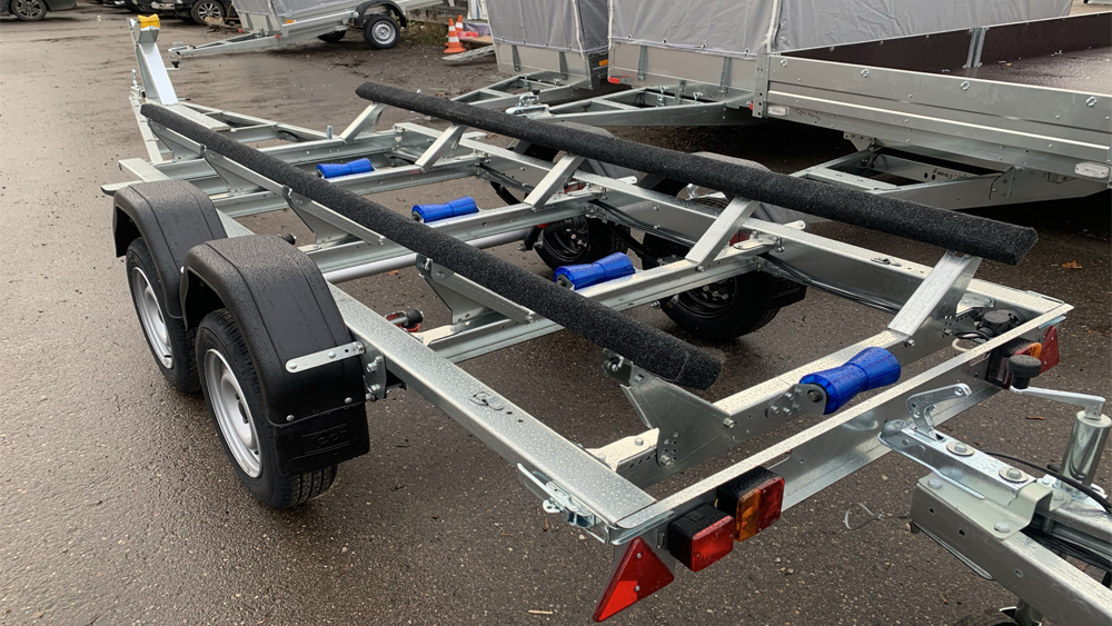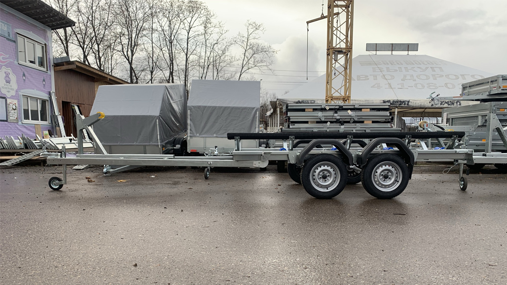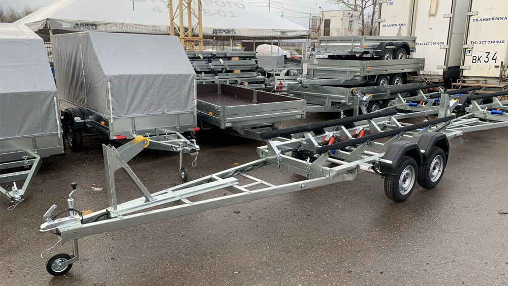 Двухосный прицеп предназначен для перевозки гидроциклов, катеров и ПВХ –лодок. Изготовлен прицеп из оцинкованного листа толщиной 3 мм. Детали изготовлены с применением лазерной технологии раскроя. Для обеспечения правильной развесовки носовой упор имеет регулировку по длине и высоте прицепа. Широкий диапазон регулировки ложементов позволяет перевозить суда с различным углом килеватости. Рессорная подвеска двухосная на 4-х рессорах с гидравлическими амортизаторами. Благодаря возможности регулировки каждой опоры по отдельности ложементы можно адаптировать под различные обводы корпуса судна. Задняя поперечина с установленными на ней фонарями съемная, что предотвращает попадания воды в фонари и замыкание светотехники.