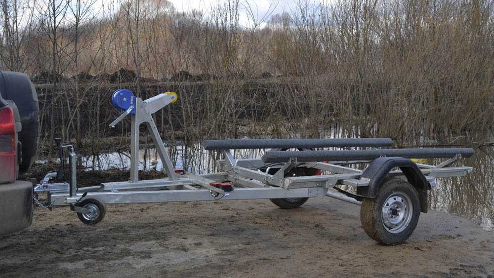 Одноосный прицеп предназначен для перевозки гидроциклов, катеров и ПВХ –лодок. Изготовлен прицеп из оцинкованного листа толщиной 3 мм. Детали изготовлены с применением лазерной технологии раскроя. Для обеспечения правильной развесовки носовой упор имеет регулировку по длине и высоте прицепа. Широкий диапазон регулировки ложементов позволяет перевозить суда с различным углом килеватости. Рессорная подвеска с резиновым подрессорником, обеспечивает плавность хода, как в груженом, так и порожнем состоянии. Особенностью прицепа является функция опрокидывания грузовой платформы и трехопорные ложементы. Опрокидывание платформы позволяет осуществлять погрузку/разгрузку судна на неподготовленном берегу водоема без необходимости заезда глубоко в воду. Благодаря возможности регулировки каждой опоры по отдельности ложементы можно адаптировать под различные обводы корпуса судна. Задняя поперечина с установленными на ней фонарями съемная, что предотвращает попадания воды в фонари и замыкание светотехники. Модель 7132-13 часто используется для перевозки ПВХ лодок для которых не требуются носовой и килевые ролики, предприятие не включает данные узлы в базовую цену прицепа. В случае необходимости (например для гидроциклов) носовой и килевые ролики, а также лебедка приобретаются отдельно.
