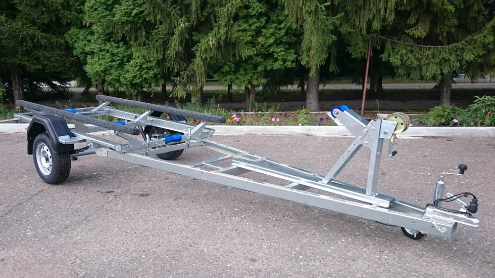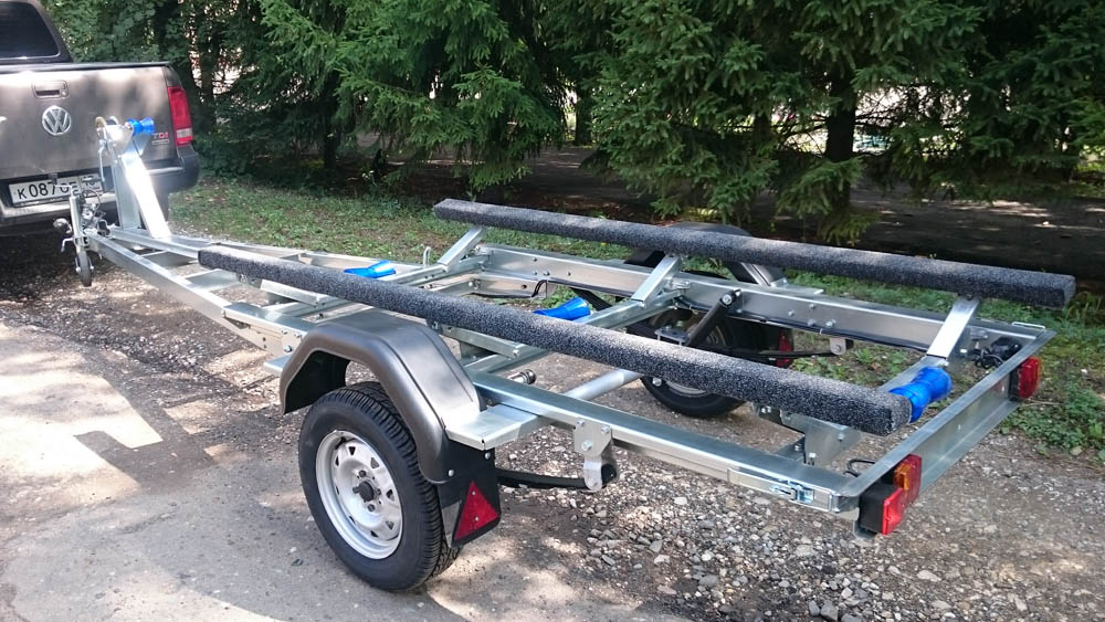 - Плавный ход прицепу обеспечивает подвеска на рессорах с резиновыми подрессорниками, основные узлы подвески применены от серийно выпускаемых автомобилей отечественного производства. Ложементы четырехопорные за счет регулировок позволяют устанавливать маломерные суда с разной геометрией корпуса.