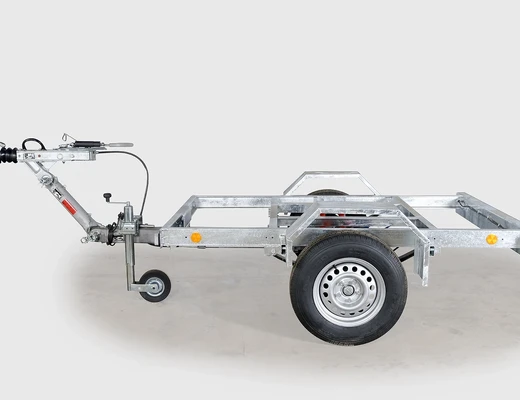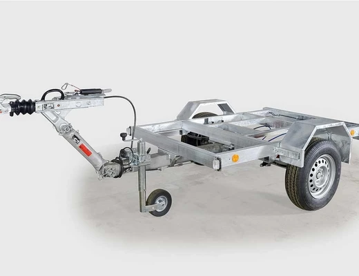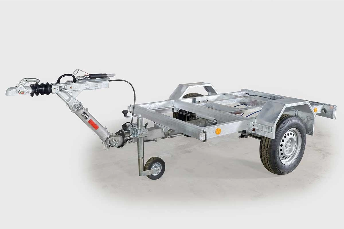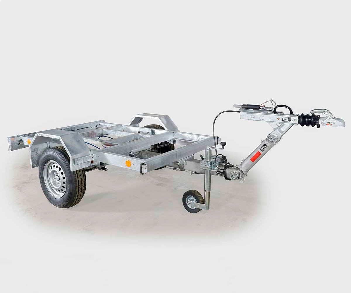 Рама, ось прицепа полностью оцинкованы методом горячего цинкования. Крылья выполнены из оцинкованной стали. Прицеп одноосный, с тормозом наката. Подвеска колес (R14) на двух полуэллиптических рессорах с гидравлическими амортизаторами. Сцепное устройство - "петля НАТО" диаметром 76 мм с регулировкой по высоте. Возможен вариант исполнения со сцепным устройством шарового типа D 50 мм. Габаритные рзмеры: - длина с дышлом 3408-3570; - ширина 1700; - высота 970 max; - колея 1500; - база 2388-2550. Размеры рамы для оборудования 2160*1260 мм. Полная масса 1800 кг. Грузоподъёмность 1480 кг. Опорное колесо в стандартной комплектации. Категория "Е" обязательна.
