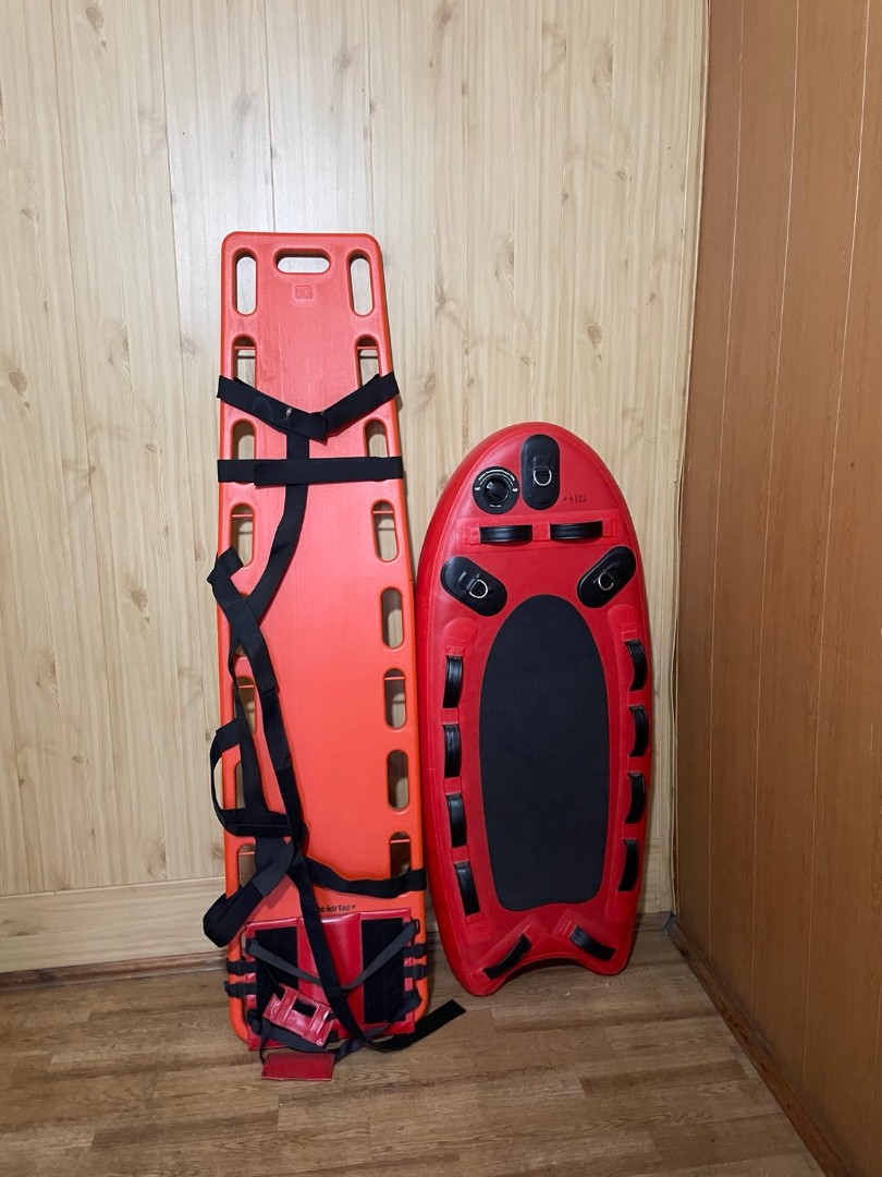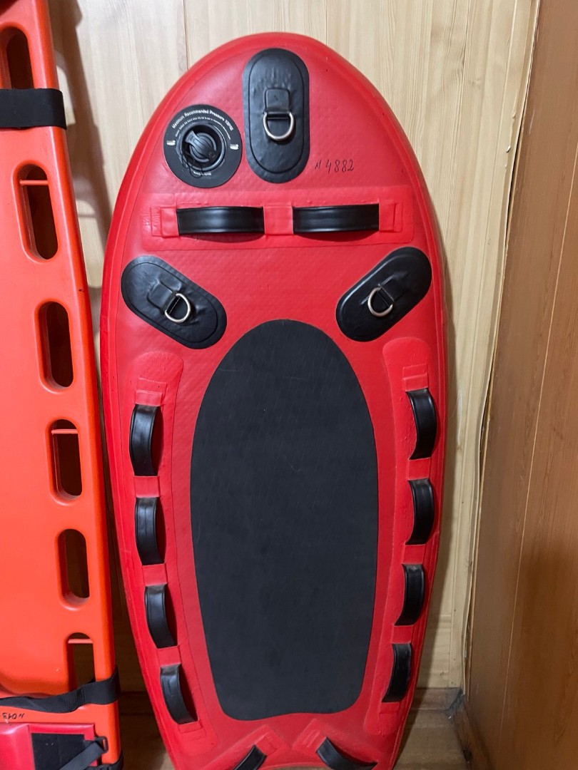 Главные особенности надувной доски: улучшенная функциональность, долговечность и доступность по сравнению с другими существующими продуктами, которые используются для спасения на сегодняшний день. На доске установлены сверхпрочные и крепкие эластичные поручни для нескольких человек или для позиционирования тела, и отверстия для веревки при спасении на льду.